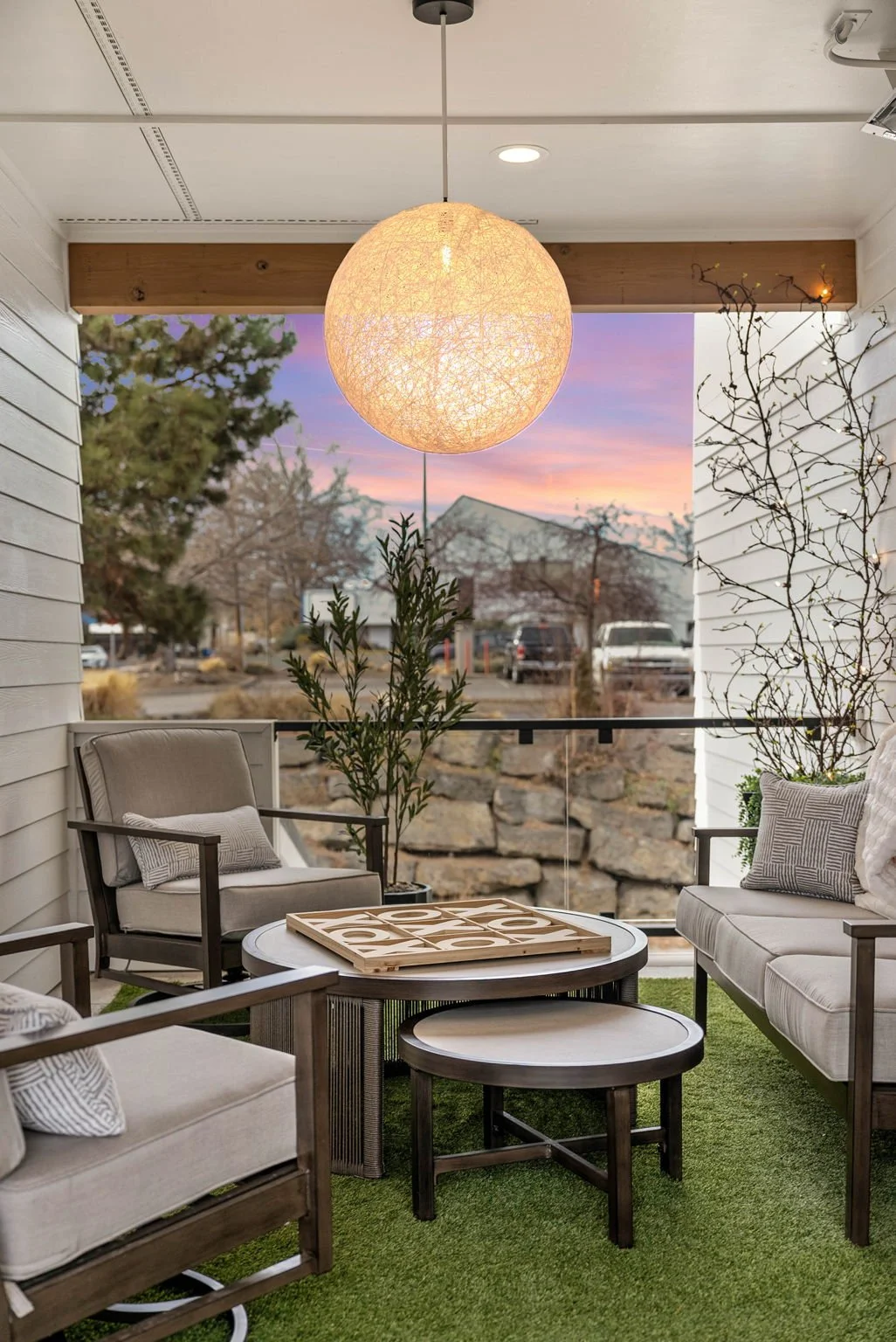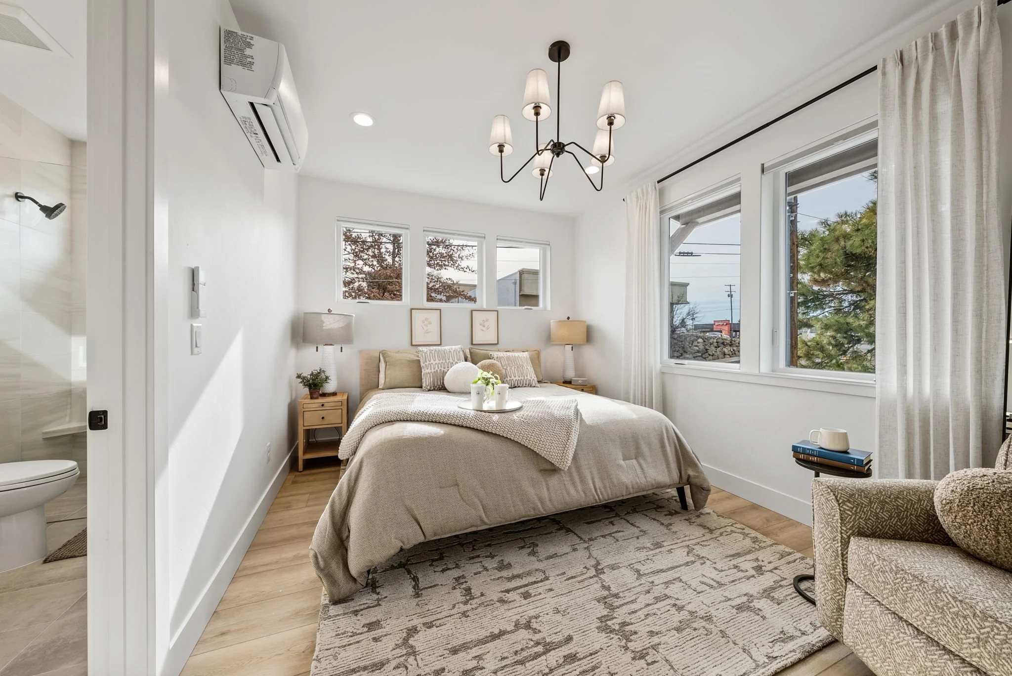 Welcome to Midtown Executive Suites, a stunning brand-new 1,265 sq. ft. furnished townhome designed for elevated, modern living just minutes from downtown Bend. This 2-bedroom, 2.5-bath residence features hardwood floors throughout, abundant natural light, high-end finishes, and a private heated upper-level terrace with turf a rare outdoor space ideal for relaxing or entertaining. The home is thoughtfully furnished with curated, modern pieces that complement the clean architectural design, creating a comfortable living environment. The kitchen is fully stocked with premium cookware, complete dishware sets, glassware, and barware, alongside brand-new Thermador stainless steel appliances, making it equally suited for everyday living or hosting. Additional features include 55" smart TVs in the living room and primary bedroom, illuminated bathroom mirrors, sleek glass shower doors, and dimmable designer lighting throughout. Located approximately 7 minutes from downtown and 8 minutes from St. Charles Hospital, this turnkey residence offers comfort, convenience, and refined everyday living.